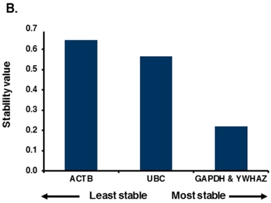 According to the geNorm algorithm, the M values below the cut-off value of 1.5 (the recommended threshold) are acceptable in the selection of internal controls for normalization in RT-qPCR [40]. As it can be seen from Figure 1A, the data output from geNorm for the first phase of evaluation indicated that glyceraldehyde-3-phosphate dehydrogenase gene (GAPDH) was the best HKG in our panel of candidate reference genes followed by succinate dehydrogenase complex subunit A, flavoprotein (SDHA), tyrosine 3 monooxygenase activation protein, zeta polypeptide (YWHAZ), and ubiquitin C (UBC). ACTB, a traditionally common reference gene in normalization of RT-qPCR data in ASD studies (Table 1) and salivary transcriptome analysis [35,37,38], was ranked among the least stable genes. The number of reference genes needed for optimal normalization was determined by geNorm based on the average pairwise variation (Vn/n + 1) below the recommended cut-off point value of 0.15. At this phase, the geNorm output indicated that the combination of the best three reference genes would be sufficient for normalization of RT-qPCR data (Figure S1).