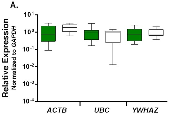 Using GAPDH, the most stable HKG ranked by both geNorm and NormFinder algorithms, as reference, and employing an improved 2−ΔCt method [43] (by taking into account the amplification efficiencies), the relative expression levels of other three genes were compared in the autistic children vs. the control group (Figure 4A). The results demonstrate that although ACTB shows a higher degree of variation compared with UBC and YWHAZ (p-values: 0.26, 0.45 and 0.82, respectively), as expected, there are no significant differences in the expression levels of any of these HKGs between the two clinical groups. By contrast, when ACTB, which was ranked as the least stable, was used as reference, the expression levels of GAPDH, UBC, and YWHAZ did not follow a normal distribution pattern, and in particular, the UBC expression levels and median values were significantly different (p = 0.03) between the autistic and control groups (Figure 4B).