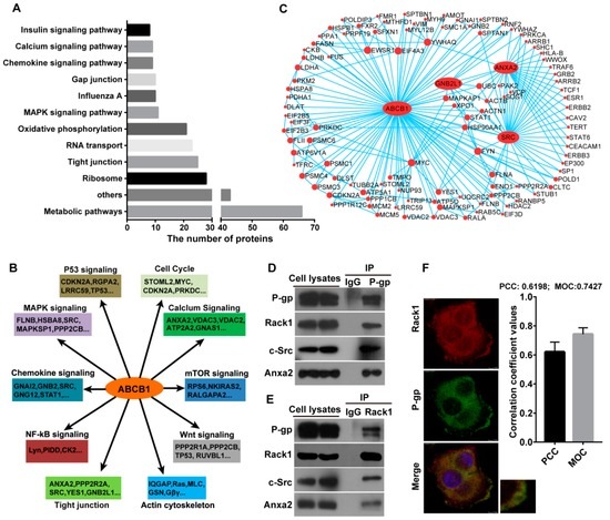 Functional characterization and validation of candidate P-gp interacting proteins identified that Rack1 was a novel binding protein of P-gp. (A) Identified P-gp interacting proteins were categorized by signal pathway in Kyoto Encyclopedia of Genes and Genomes (KEGG) database; (B) The association of the major P-gp binding proteins with cellular signaling pathways involved in cancer; (C) Network of P-gp interacting proteins. A total of 108 P-gp interacting proteins were mapped via protein-protein interaction databases searches using the VisAnt software and visualization in Cytoscape; only proteins that interact with at least two other proteins are shown. Nodes represent proteins; lines represent interactions; and node size indicates the interaction degree; (D) Co-immunoprecipitation assay showed that endogenous P-gp interacted with endogenous Rack1, c-Src and Anxa2 in drug-resistant breast cancer cells. MCF-7/ADR cells were lysed, immunoprecipitated with anti-P-gp antibody and then analyzed by western blotting with anti-P-gp, Rack1, c-Src or Anxa2 antibody; (E) Endogenous Rack1 interacted with endogenous P-gp, c-Src and Anxa2 in breast cancer cells. MCF-7/ADR cells were lysed, immunoprecipitated with anti-Rack1 antibody, followed by Western blotting analysis; (F) Confocal immunofluorescence microscopy analysis showed that Rack1 was colocalized with P-gp in MCF-7/ADR cells (Red: Rack1, Green: P-gp, Yellow: Merge; 600× magnification). Image J software (NIH, Bethesda, MD, USA) was used to quantify the colocalization efficiency. The plasma membrane regions of the cells were selected as the region of interest. Both Pearson’s correlation coefficient (PCC) and Mander’s overlap coefficient (MOC) were used to calculate the degree of colocalization between Rack1 and P-gp. Thirty images were analyzed.