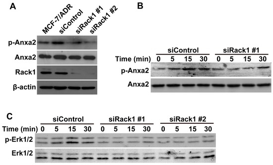 Tyrosine phosphorylation of Anxa2 is critical for cancer cell migration and invasion [41]. P-gp was previously reported to interact with Anxa2 and to regulate its tyrosine phosphorylation [7]. We performed the Western blot assay to investigate the possible effect of the attenuated interaction between P-gp and Anxa2 induced by Rack1 reduction on Anxa2 phosphorylation. As shown in Figure 5A, silencing of Rack1 inhibited the basal level of Anxa2 phosphorylation. Consistently, knockdown of Rack1 also inhibited adriamycin-induced phosphorylation of Anxa2 (Figure 5B). Moreover, knockdown of Rack1 also inhibited adriamycin-induced Erk1/2 phosphorylation (Figure 5C), which agrees with the previous report that Anxa2 promotes the migration and invasion of MCF-7 cells through regulation of Erk1/2 signaling. Therefore, these data suggest that Rack1 was necessary for adriamycin-induced Anxa2 phosphorylation.