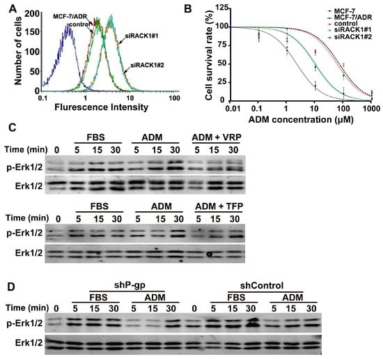 Knockdown of Rack1 inhibited P-glycoprotein activity and P-gp is required for adriamycin (ADM)-induced Erk1/2 phosphorylation. (A) Knockdown of Rack1 significantly reduced the efflux rate of fluorescent dye Rh-123 in MCF-7/ADR cells as measured by using flow cytometry; (B) Knockdown of Rack1 enhanced the drug sensitivity to adriamycin in MCF-7/ADR cells. Control and Rack1 silenced cells were seeded in a 96-well plate at a density of 1 × 104 cells per well and cultured for 24 h. Then, different concentrations of adriamycin were added into each well. After incubation for 72 h at 37 °C, the cell viability was determined using the CCK-8-based method by measuring the absorbance at 450 nm on a micro-ELISA reader. The assays were performed using three replicates for each drug concentration. IC50 was calculated by using the GraphPad Prism 6.00 software; (C) Inhibition of P-gp activity inhibited adriamycin-induced Erk1/2 phosphorylation. Cells were starved for 24 h in the presence or absence of TFP or VRP and then exposed with different concentrations of adriamycin for different time points, then cells were lysed, and total cell lysate was further analyzed by Western blotting. FBS was used as positive control; (D) Knockdown of P-gp impaired adriamycin-induced phosphorylation of Erk1/2 in MCF-7/ADR cells. Control and P-gp knockdown cells were starved for 24 h and then exposed with different concentration of adriamycin for different time points; the cells were lysed and total cell lysate was further analyzed by Western blotting. FBS was used as a positive control. VRP, verapamil; TFP, trifluoperazine.