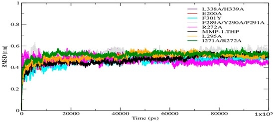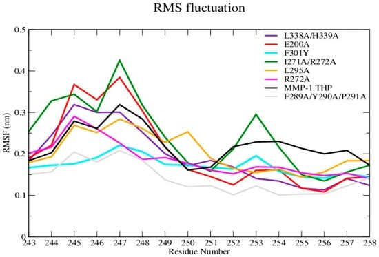 The prior MMP-1 mutagenesis studies provided a background to examine the atomistic effects of MMP-1 mutations. MD simulations are applied herein to understand how MMP-1 mutations perturbed the local structure and also to investigate the long-range effects on MMP-1 structure, dynamics, and interactions with a THP. MD simulations have been successfully applied previously to study the effect of mutations on key structural determinants in different enzymes [13,14,15,16]. In order to understand their influence on MMP-1 structure–function relationships, MD simulations were performed on the seven previously described mutants [5,6,7]: E200A, F301Y, F289A/Y290A/P291A, I271A/R272A, L338A/H339A, R272A, and L295S.