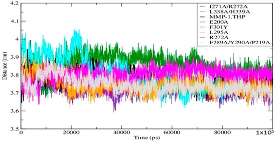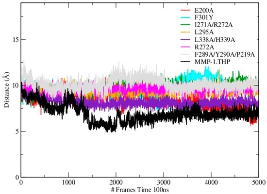 The Radius of Gyration (Rg) of the mutants and WT MMP-1•THP showed similar profiles of structural compression as a function of simulation time (Figure 5; Table S5), with L295A showing the smallest Rg and R272A the largest. The compressions of the structures during simulations of the mutants are consistent with the MMP-1•THP simulation studies [11] and was consistent with the closed or collapsed form of MMP-1 observed in the 4AUO X-ray crystallographic structure [11]. The small differences in the averaged values of the Rg and in the distances between centers of mass between both domains (Figure 6; Table S5) indicate subtle but distinct effects of the mutations on the MMP-1•THP structure and flexibility.
