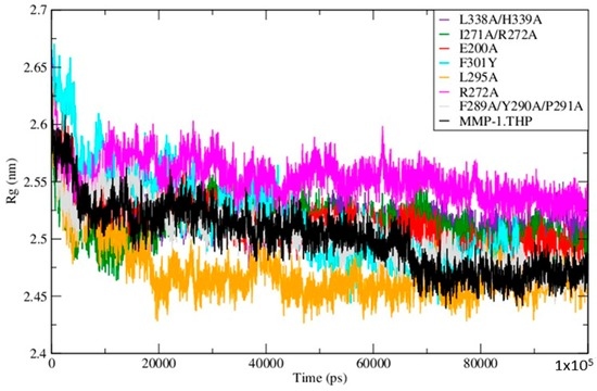 Figure 5. The radius of gyration of the mutants and WT MMP-1•THP.