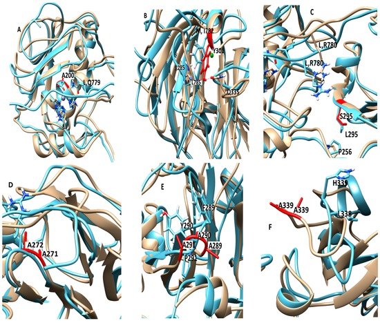 Figure 7. Locations of the mutants in the structure of MMP-1•THP. (A) E200A (1.21 Å); (B) F301Y (1.24 Å); (C) L295S (1.30 Å); (D) I271A/R272A (1.3 Å); (E) F289A/Y290A/P291A (1.23 Å); and (F) L338A/H339A (1.9 Å). The most populated cluster of MMP-1•THP (cyan) is superimposed on the most populated cluster structure from the different mutants (brown) (The RMSD between the mutant structure and the WT MMP-1•THP are indicated in parentheses). Zn2+ and Ca2+ are shown in spherical representation in ice blue and green, respectively.