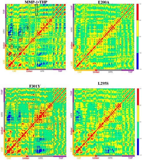 Figure 8. The dynamic cross correlation analysis (DCCA) of MMP-1•THP and mutants. The scale of correlated motion ranges from +1 to −1 and represents positive (red) and negative (blue) motions of Cα atoms. The analysis was performed using Bio3D package [23] in R for WT MMP-1•THP, the areas labeled 1–7 indicate positive correlated motions, while the areas labeled 1*–3* indicate negative correlated motions.