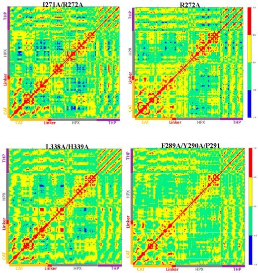 The I271A/R272A mutant (Figure 7D) showed an increase in the RMSF of blade I residues ranging from 275-285 (β7–β8) and 295-310 (loop region β9–β10) (Figure S17) and also increased flexibility seen in residues 345–355 of blade II of the HPX domain (Table S2). The extent of anti-correlated motions in I271/R272 is similar to WT MMP-1•THP and new anti-correlated motion emerged (Figure 8). The HPX domain showed anti-correlated motions between the CAT domain and strands of the THP. The linker region exhibited anti-correlated motion towards the HPX domain. New correlated motions between the HPX domain and the CAT domain appeared. The R272A mutant showed a similar profile to dynamic cross correlated motions of I271/R272A, but with smaller magnitudes (Figure 8).