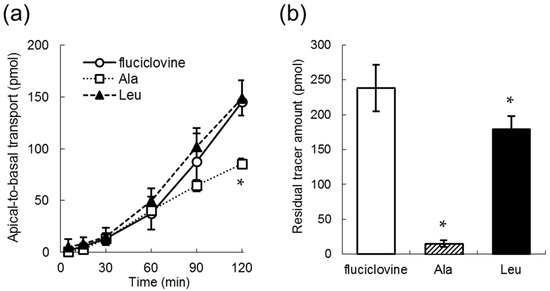 (a) Time course of 14C-labeled amino acid (10 µM) transport through the LLC-PK1 monolayers after 4–5 days culture (n = 3–6); (b) the residual amount of intracellular amino acid tracer at 120 min (n = 3–6); “fluciclovine”, “Ala”, and “Leu” indicate “[14C]fluciclovine”, “l-[14C]alanine”, and “l-[14C]leucine”, respectively. Each data point represents the mean ± SD. * p < 0.05 vs. fluciclovine.