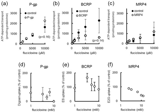 (a–c): The concentration dependency of [14C]fluciclovine in (a) P-glycoprotein (P-gp)-; (b) breast cancer resistance protein (BCRP)-; and (c) multidrug resistance-associated protein 4 (MRP4)-expressing inside-out vesicles; (d–f): the inhibition of tracer uptake by unlabeled fluciclovine in (d) P-gp-; (e) BCRP-; and (f) MRP4-expressing inside-out vesicles. Each data point represents the mean ± SD (n = 3–6). “ES” and “E2G” indicate “[3H]estrone-3-sulfate” and “[3H]estradiol-17β-d-glucuronide”, respectively.