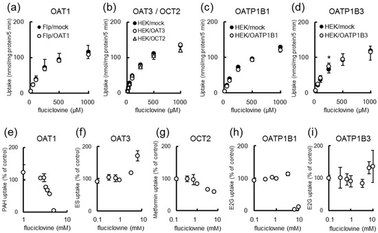 (a–d): The concentration dependency of the [14C]fluciclovine uptake in (a) organic anion transporter 1 (OAT1)- (b) organic anion transporter 3 (OAT3)-/ organic cation transporter 2 (OCT2)- (c) organic anion transporting polypeptide 1B1 (OATP1B1)- and (d) organic anion transporting polypeptide 1B3 (OATP1B3)-expressing cells; (e–i): the inhibition of tracer uptake by unlabeled fluciclovine in (e) OAT1-; (f) OAT3-; (g) OCT2-; (h) OATP1B1-; and (i) OATP1B3-expressing cells. Each data point represents the mean ± SD (n = 3–6); * p < 0.05. “PAH”, “ES”, “Metformine” and “E2G” indicate “p-[14C]aminohippurate”, “[3H]estrone-3-sulfate”, “[14C]metformin”, and “[3H]estradiol-17β-d-glucuronide”, respectively.