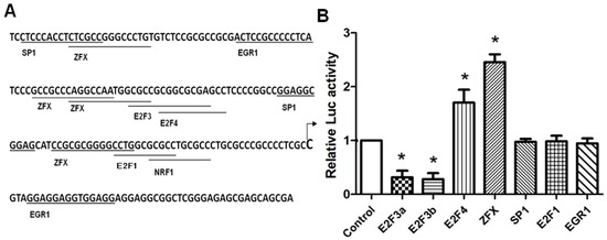 The Genomatix software (Munich, Germany; http://genomatix.de/cgi-bin/matinspector_prof/mat_fam.pl.) and JASPAR database (Copenhagen, Denmark; http://jaspar.binf.ku.dk/cgi-bin/jaspar_db.pl.) were used to predict transcription factor binding sites. Several highly scored binding sites were identified within the 204 bp (−157/+47) region, including those for Sp1, E2F1, E2F3, E2F4, EGR1, and ZFX (Figure 2A). To determine whether these putative sites are functional, co-transfection was performed with plasmids expressing these transcription factors and P5 plasmid, the construct containing the minimal promoter. As shown in Figure 2B, E2F1, Sp1 and EGR1 overexpression had no significant effect. E2F3a and E2F3b overexpression significantly suppressed SET promoter activity in HeLa cells (p < 0.05). Since E2F3a displayed a similar inhibitory activity in P5, P6, and P7 truncated promoters (Figure S2) The uniform inhibition could be a non-specific effect, or suggest the presence of an E2F3a-related, negative regulatory element further downstream of the deleted region. Since SET is overexpressed in cancer cells, from a pathologic point of view, we are more interested in factors upregulating SET expression, and the E2F3a-mediated negative effects was not pursued further. On the other hand, E2F4 and ZFX overexpression significantly increased SET promoter activity, to 1.8-fold and 2.3-fold (p < 0.05), respectively. We elected to focus on ZFX, the factor appeared to account for a large portion of the SET promoter activity.