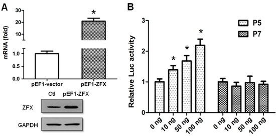 ZFX transactivates human SET transcript 2 promoter. (A) HeLa cells were transfected with 100 ng of pEF1-ZFX or pEF1-vector (control). At 48 h post-transfection, total RNA and proteins were isolated and ZFX expression was determined. Top panel: Results of real-time PCR showing a dramatic increase of ZFX RNA mRNA following ZFX overexpression. Bottom panel: Results of Western blotting showing an increased ZFX protein expression. GAPDH protein expression was determined and the results indicated equal protein loading; (B) Dose-dependent effect of ZFX on SET promoter activity. HeLa cells were co-transfected with increasing amounts of pEF1-ZFX (0–100 ng, pEF1-vector was used as a “stuffer” to keep a constant DNA amount) and 100 ng of P5 or P7 reporter plasmid. Luciferase activity was measured at 24 h post-transfection. Quantitative data is presented as means ± SD from three independent experiments. (*, p < 0.05).