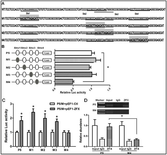 To determine the significance of each ZFX-binding site, site-directed mutagenesis was performed (Figure 4). Four plasmids with each containing a mutation on individual ZFX-binding site were constructed and designated as M1-4 (Figure 4A). The activities of mutant promoters and the parental P5 wild type promoter were compared. As shown in Figure 4B, mutation of the first, second, and third binding sites had no significant effect on promoter activity, whereas mutation of the fourth binding site led to a 50% reduction of promoter activity.