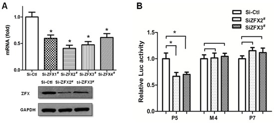Removal of ZFX-binding site led to a loss of response to ZFX knockdown. (A) HeLa cells were transfected with either the non-specific siRNA (Si-Ctl) or one of four ZFX-targeting siRNAs (Si-ZFX1#, Si-ZFX2#, Si-ZFX3# and Si-ZFX4#). Si-ZFX2# and Si-ZFX3# were found to be the most effective for ZFX knockdown. Top panel: Measurement of ZFX mRNA levels. Bottom panel: Western blotting detection of ZFX protein, with GAPDH detected as a control for protein loading; (B) When ZFX expression was knocked down, a decreased reporter activity was observed in the P5 construct containing the Site4 ZFX-binding sequences. No change of reporter activity was observed in P7 in which Site4 was deleted. Similarly, no change in reporter activity was observed in M4 in which Site4 sequences were mutated. Results are presented as means ± SD from three independent experiments. (*, p < 0.01).