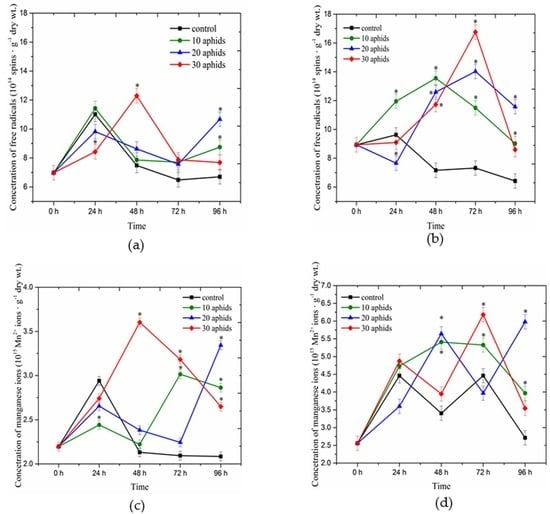2.1. Concentrations of Free Radicals and Mn2+ Ions Detected Using Electron Paramagnetic Resonance Spectroscopy in Asparagus officinalis Infested by Brachycorynella asparagi