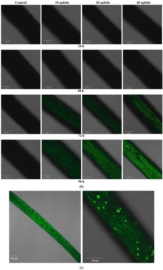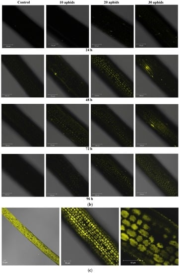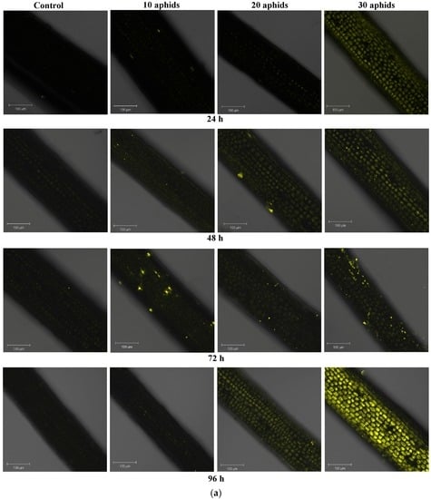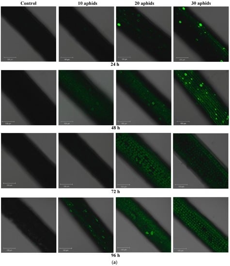 - Kuśnierczyk, A.; Winge, P.; Jørstad, T.S.; Troczyńska, J.; Rossiter, J.T.; Bones, A.M. Towards global understanding of plant defence against aphids—Timing and dynamics of early Arabidopsis defence responses to cabbage aphid (Brevicoryne brassicae) attack. Plant Cell Environ. 2008, 31, 1097–1115. [Google Scholar] [CrossRef] [PubMed]
