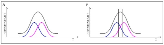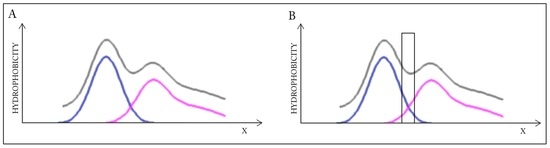 Schematic depiction of a system in which only one monomer contains a prominent hydrophobic core. Elimination of residues involved in complexation (right-hand image) leads to better accordance with the model when considering the dimer as a whole. Blue and pink lines: distributions in monomers, gray line: distribution in dimer. (A) Status of the individual monomers (blue and pink) versus the resultant distribution in dimer (gray); (B) The removal of the interface (black bar) does not change the status of the dimer—Distribution still discordant versus the expected one.