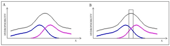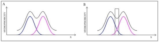 Schematic depiction of a system in which the dimer as well as its individual monomers contain well-defined hydrophobic cores. Elimination (black bar on the right profile) of residues involved in complexation distorts the dimeric core. Blue and pink lines: distributions in monomers, gray line: distribution in dimer. (A) Status of the individual monomers (blue and pink) versus the resultant distribution in dimer (gray); (B) The removal of the interface (black bar) does not change the status of the dimer—Distribution accordant versus the expected one.