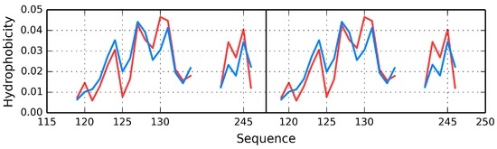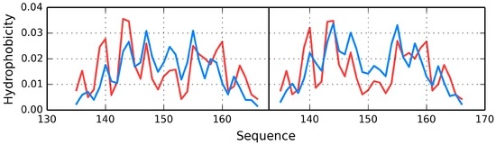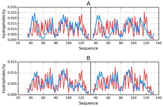 A similar relation between structure and function can be observed in the immunoglobulin-like domain of titin (1TIT) [50,55]. This protein, which is expressed in muscle tissue, must adapt to external forces while retaining shape memory. Much like other proteins discussed in this paper, titin exhibits good accordance with the theoretical hydrophobicity density distribution model, with domain-specific RD values as low as 0.32. It seems that the presence of a well-ordered hydrophobic core is a critical factor in ensuring that the protein reverts to its original conformation in the absence of external forces (note, however, that other immunoglobulin-like domains which also follow the “two-layer sandwich” blueprint do not conform to the model with such high accuracy).