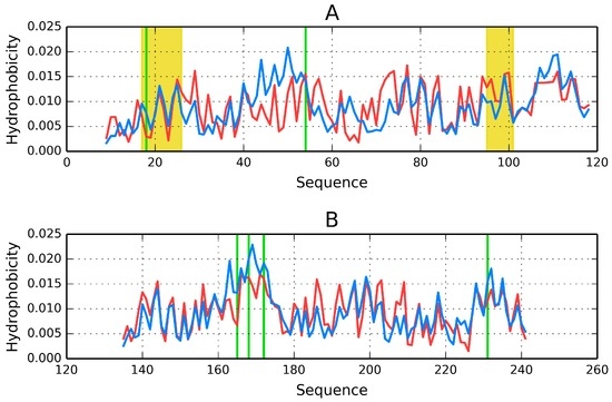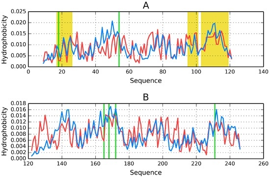 Theoretical (blue line) and observed (red line) hydrophobicity density distribution profiles in dystrophin: A—CH1 (complete domain), B—CH2 (complete domain). Green lines: positions of disease-related mutations, yellow area: fragment interacting with actin.