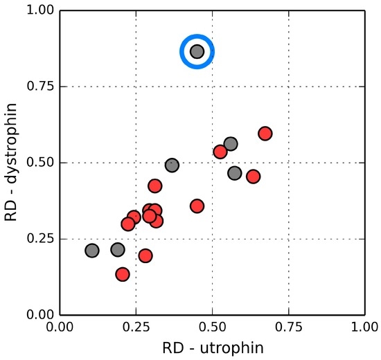 Relation between the status of individual secondary folds in dystrophin and in utrophin. The blue circle marks an outlier which corresponds to an exposed loop. Red: helices, gray: loops.