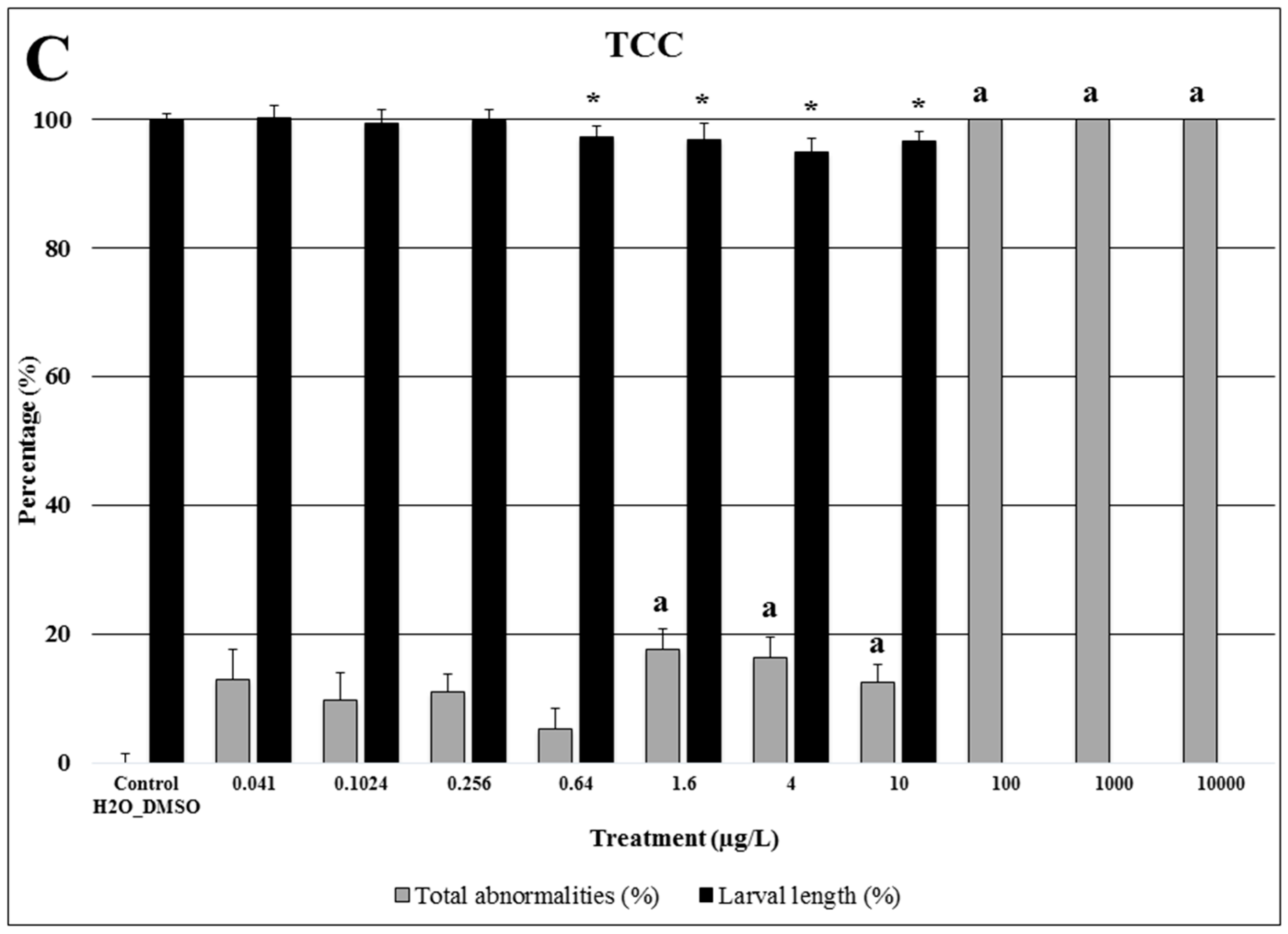 Zebrafish embryos were affected by triclocarban at concentrations above environmental relevance. However, the impact in sea urchin larval length was observed at environmentally relevant concentrations (LOEC = 0.64 µg/L). Taken together with the available data in the literature, it strongly indicates that triclocarban is likely to impact the most sensitive taxa at environmentally relevant concentrations.