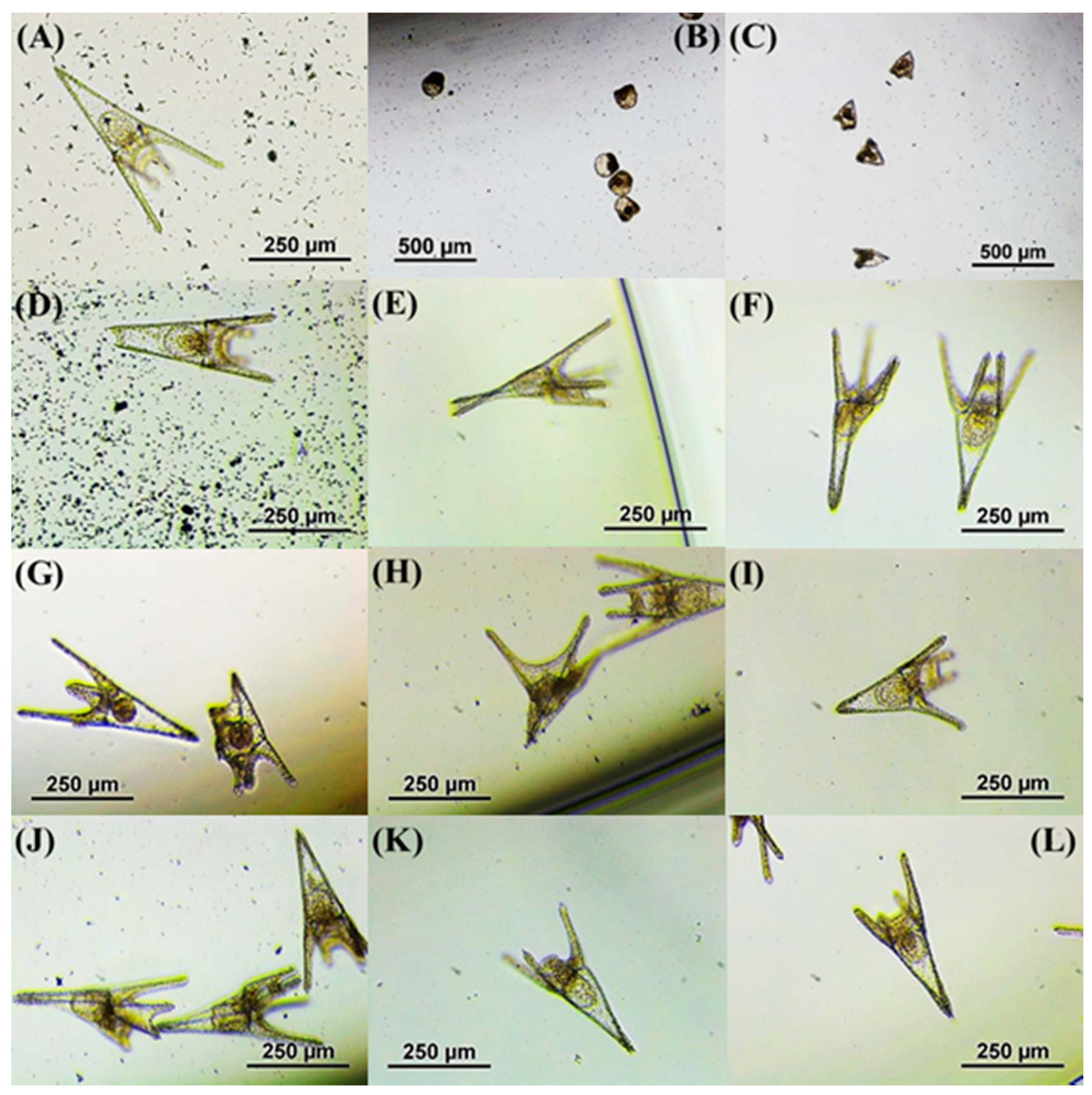 Embryonic stages and developmental abnormalities of the sea urchin Paracentrotus lividus observed in this study after 48 h of incubation under controlled conditions of temperature and light: (A) normal larva at pluteus stage; (B) gastrula stage; (C) prism larvae; (D) separated tip; (E,F) crossed tip; (F,G) fused arms; (G) general abnormal larvae; (H,I) abnormal arms orientation; (J) deformed arms; (K) arms absence; and (K,L) asymmetric arms.