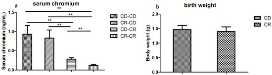 At weaning, body weight (22.1 ± 2.5 g vs. 22.8 ± 3.1 g, n = 8 per group) and fasting blood glucose (5.9 ± 0.8 mmol/L vs. 6.1 ± 1.2 mmol/L, n = 8 per group) in mother mice were not affected by chromium restriction. However, serum chromium concentrations were lower (p < 0.01) in the CR (chromium-restricted diet) group (0.33 ± 0.04 ng/mL, n = 8 per group) than that in CD (control diet) group (0.75 ± 0.12 ng/mL, n = 8 per group).