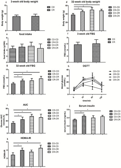 Fasting insulin and HOMA-IR were higher in the CR-CD group and the CR-CR group than that in the CD-CD group (p < 0.05, Figure 1j,k).
