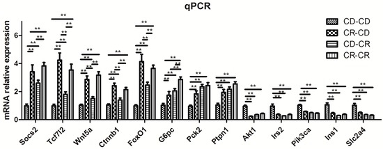Since network analysis showed the insulin signaling pathway and Wnt signaling pathway were in the center of all 463 differentially-expressed genes in the CR-CD group compared with the CD-CD group, thirteen differentially-expressed genes in the insulin signaling pathway and Wnt pathway were selected to perform real-time PCR. Real-time PCR results showed that trends in change of expression for the selected 13 genes were consistent with the microarray results. Socs2, Tcf7l2, Wnt5a, Ctnnb1 (catenin, beta1), G6pc, Pck2 (Pepck), FoxO1, and Ptpn1 (Ptp1b) showed higher expression levels, and lower expression in Akt1, Irs2, Pik3ca, Slc2a4 (Glut4), and Ins1 in the CR-CD, CD-CR, and CR-CR groups than that in the CD-CD group (Figure 3, p < 0.01).