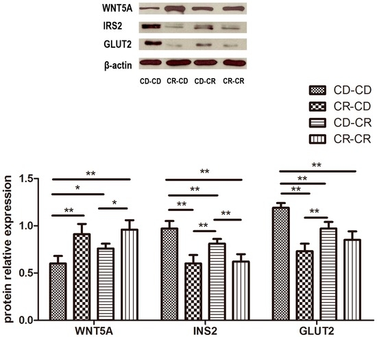 Total protein expression of IRS2 and SLC2A2 (GLUT2) was down-regulated, while WNT5A was up-regulated more significantly in the CR-CD, CD-CR, and CR-CR groups than in the CD-CD group (p < 0.01, Figure 4).