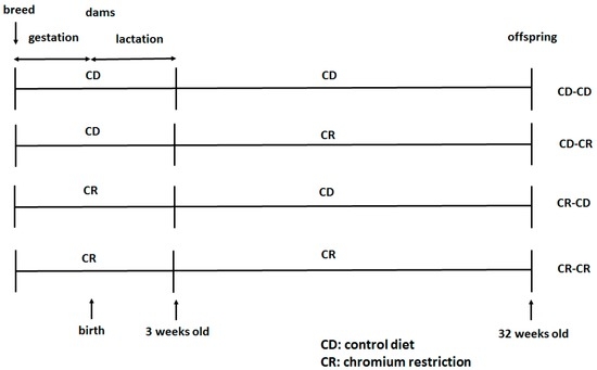 All procedures were performed with the approval of the Animal Care Committee of the Peking Union Medical Hospital Animal Ethics Committee (Project identification code: MC-07-6004, 15 March 2013), and all efforts were made to minimize suffering. Seven-week-old female and male C57BL mice (18.4 ± 1.3 g) were purchased from the Institute of Laboratory Animal Science, Chinese Academy of Medical Sciences and Peking Union Medical College (Beijing, China, SCXK-2013-0107). All mice were maintained in individual cages in a room at 24 ± 1 °C with lights on from 6:00 a.m. to 6:00 p.m. Mating was performed by housing females with adult males overnight, and pregnancy was confirmed by examining vaginal smears for the presence of sperm. After mating, the females were randomly divided into two groups and fed either the control diet (CD, casein-based diet based on the American Institute of Nutrition AIN-93G diet, containing 1.19 mg chromium/kg diet) or a chromium-restricted diet (CR, only reduced by 90 percent of chromium potassium sulfate from the control diet, containing 0.14 mg chromium/kg diet). The concentration of chromium in the diet was analyzed by an atomic absorption spectrometer (TAS986, Beijing Persee General Corperation, Beijing, China). All diets were produced by Research Diets (New Brunswick, NJ, USA). Mice were fed with this diet during the pregnancy and lactation periods. After the birth of the offspring, the litter size in each cage was randomly adjusted to six pups (three males, three females, if possible) to ensure equal nutrition until the pups were weaned.