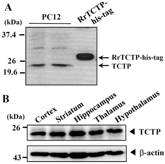 Endogenous translationally controlled tumor protein (TCTP) expression in PC12 cells and rat brain. Proteins extracted from PC12 cells (3 × 106 cells, about 40 µg; (A)), recombinant RrTCTP-his-tag (10 µg; (A)); and rat brain tissues (indicated regions, 40 µg; (B)) were analyzed by immunoblotting using murine anti-TCTP antibody.