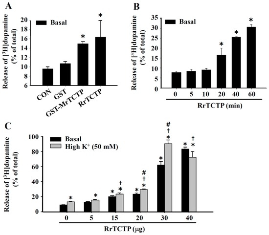TCTP stimulates both basal spontaneous and depolarization (50 mM KCl)-induced release of dopamine from PC12 cells. PC12 cells preloaded with [3H]dopamine were washed and incubated at 37 °C with rat recombinant TCTP (RrTCTP) (15 µg/mL, (A,B); 5–40 µg/mL, (C)), GST-tagged mouse recombinant TCTP (GST-MrTCTP) (50 µg/mL, (A)) or GST (50 µg/mL, (A)) for 20 min (A,C) or indicated time periods (B), under basal (5 mM KCl) or high K+ (50 mM KCl) KR buffer conditions. The amount of [3H]dopamine released into the culture supernatant was significantly increased by both RrTCTP and GST-MrTCTP, but not by GST alone (A). The rTCTP-induced stimulation of dopamine release was time- (B) and dose-dependent (C). * p < 0.05 relative to basal control release; † p < 0.05 relative to high K+ control release; # p < 0.05 relative to basal release.