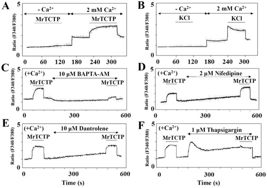 Next, it was further investigated whether the rTCTP-induced [Ca2+]i increase was due to the mobilization of Ca2+ from intracellular stores by utilizing dantrolene, which blocks Ca2+ release from the endoplasmic reticulum (ER). The rTCTP-evoked cytosolic Ca2+ current was also not affected by dantrolene (10 µM), as shown in Figure 3E. Our data indicate that the rTCTP-induced increase in [Ca2+]i was due to a Ca2+ influx from an extracellular source rather than via voltage-gated L-type Ca2+ channels, and that rTCTP does not mobilize Ca2+ from intracellular stores. Thapsigargin, an inhibitor of Ca2+-ATPase in the membranes of ER Ca2+ stores, is generally used to inhibit refilling of Ca2+ stores and subsequently depleting Ca2+ from Ca2+ stores in various cells [15,16], including PC12 cells. When PC12 cells were exposed to 1 µM thapsigargin in a Ca2+-containing buffer, it caused a sustained increase in [Ca2+]i, confirming that intracellular Ca2+ stores are releasable under our experimental conditions. When 50 µg MrTCTP were added in the medium that contained both Ca2+ and thapsigargin, further rise in [Ca2+]i was not produced by rTCTP (Figure 3F).