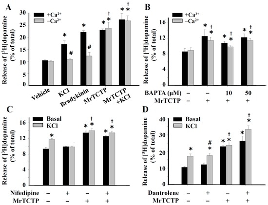 TCTP induced dopamine release from PC12 cells via Ca2+-independent pathways. [3H]Dopamine-preloaded PC12 cells were washed and treated in Ca2+-containing buffer (+Ca2+) or Ca2+-free buffer (−Ca2+) with 50 mM KCl, 1 µM bradykinin, and 50 µg/mL MrTCTP (A); [3H]Dopamine-preloaded PC12 cells were washed, pretreated for 20 min at 37 °C with 10 or 50 µM BAPTA-AM (B); 2 μM nifedipine (C); or 10 μM dantrolene (D); and then treated for 20 min with 50 µg/mL MrTCTP with the continued presence of above agent where indicated, in the basal and the high K+ (50 mM KCl) buffers. [3H]Dopamine release into media is expressed as relative to total [3H]dopamine loaded. Data are presented as Mean ± S.E.M. (standard error of mean) * p < 0.05 relative to control basal release; † p < 0.05 relative to control high K+ release; # p < 0.05 relative to respective basal release.