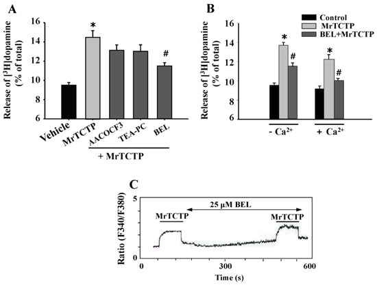 The effects of phospholipase A2 (PLA2) inhibitors on TCTP-induced dopamine release from PC12 cells. (A,B) PC12 cells were pre-incubated for 20 min at 37 °C with 25 µM AACOCF3, 10 µM TEA-PC, or 25 µM BEL, and then treated with 50 µg/mL MrTCTP for an additional 20 min in Ca2+-containing (+Ca2+), or Ca2+-free (−Ca2+) buffer. The amount of [3H]dopamine released into the culture supernatant was measured. * p < 0.05 relative to control release; # p < 0.05 relative to MrTCTP-treated release; (C) the fluorescence experiments were carried out at room temperature in the Ca2+ (2 mM CaCl2)-containing buffer. PC12 cells were loaded with 5 µM Fura-2-AM for 30 min and then washed multiple times. The cells were pretreated with 25 µM BEL for 5 min, and then exposed to 50 µg/mL MrTCTP.
