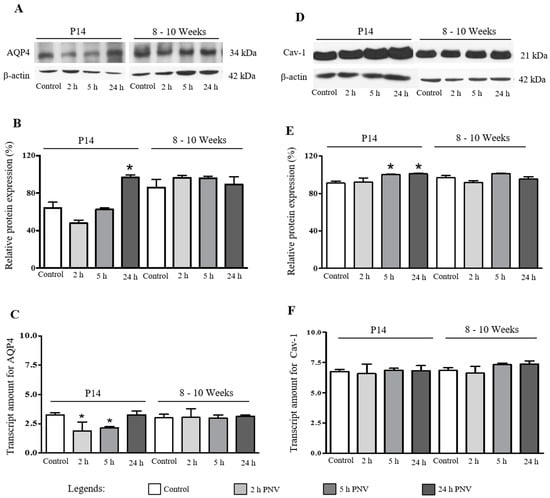 In regard to Cav-1, WB assay showed slight but significant up-regulation at 5 and 24 h post-PNV administration in neonate group (p < 0.05) while no differences were found between control and PNV-treated groups in adult rats (Figure 1D,E). Likewise, no differences were observed in mRNA levels in both ages (Figure 1F). The alterations in AQP4 and Cav-1 in neonate rats were significantly more prominent than in adult rats.