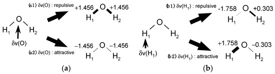 Then, for the case of Figure 1a, the LRF-BO value, , indicates not only that the repulsive potential to the oxygen site strengthens O-H bonds of water, but also that the attractive potential weakens the bond, of which situations are illustrated in Figure 2a. Similarly, the meaning of values shown in Figure 1b is two-fold, as shown in Figure 2b.