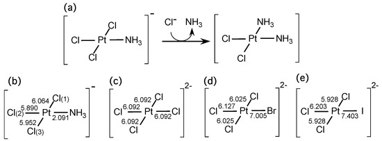 (a) The substitution reaction step to yield cisplatin. Calculated LRF-BO values for (b) [Pt(NH3)Cl3]−; (c) [PtCl4]2−; (d) [PtBrCl3]2−; and (e) [PtBrCl3]2−.