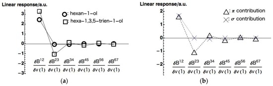 We then evaluated the LRF-BO values of all chemical bonds on the main chain for the perturbation, . Figure 7a shows the LRF-BO values for the chemical bonds of the main chains of the hexan-1-ol and hexa-1,3,5-trien-1-ol (all calculated LRF-BO values are presented in Tables S4–S6 in supplementary materials for hexan-1-ol, hexa-1,3,5-trien-1-ol, and contributions of hexa-1,3,5-trien-1-ol, respectively). It is found from Figure 7a that the fluctuation of bond-orders of the hexan-1-ol molecule is nearly localized in the bond between O(1) and C(2). In contrast, the profile of the LRF-BO values of hexa-1,3,5-trien-1-ol, in which points are indicated as squares, exhibits a oscillating behavior. As in the case of LRF-D values, we divide the LRF-BO values of the hexa-1,3,5-trien-1-ol into and contributions, which are shown in Figure 7b. We can see from this figure that the contribution indicated by the X points shows the behavior similar to that of the hexan-1-ol molecule shown in Figure 7a, while the contribution indicated by the triangular points is obviously a main cause of the oscillating behavior of the total LRF-BO values.