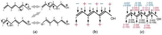 The responses on all carbons (~) for hexan-1-ol and hexa-1,3,5-trien-1-ol are plotted in Figure 6a (to be complete, we present all the LRF-D values in Tables S1–S3 in supplementary materials for hexan-1-ol, hexa-1,3,5-trien-1-ol, and contributions of hexa-1,3,5-trien-1-ol, respectively). We can see from this figure that the response of hexan-1-ol decreases monotonically and rapidly from the nearest site to the farthest site, being consistent with the picture of the inductive effect of the saturated system. This contrasts with the response on the conjugated chain of hexa-1,3,5-trien-1-ol, which also decays from to but with the oscillating behavior. To analyze the behavior of the LRF-D values further, we divided the LRF-D values into and contributions according to the method Fias et al. used [13]. The results are shown in Figure 6b. This figure shows that the contribution of the LRF-D of hexa-1,3,5-trien-1-ol is similar to that of hexan-1-ol. In particular, we found that the plus value of of hexa-1,3,5-trien-1-ol is a result of the inductive effect mainly from the contribution. On the other hand, being maximum at of the contribution obviously corresponds to the resonance picture of the conjugated network (see Figure 6a below), implying that LRF-D becomes an indicator of density fluctuations that are results from inductive and resonance effects of organic molecules. These results are similar to those of reference [14], indicating that our numerical treatment is valid for our purposes.
