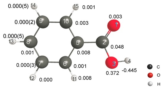 Finally, we would like to explore the applicability of LRF-BO to the acid dissociation reaction of benzoic acids. We shall focus on the response of the bond-order between the oxygen and the hydrogen atoms of the carboxylate for the virtual perturbation that is applied to each atom in the benzoic acid molecule. In Figure 9, we listed the calculated results of the LRF-BO values, . The response values are remarkably large for the case that the perturbation is placed on or nearby the carboxylate, in particular on O(14) and H(15) atoms of which the target O-H bond is composed, while the values become nearly zero for the perturbation that is applied to the other (phenyl) part. Not surprisingly, the absolute value of LRF-BO, is maximum for the case, L = H(4), implying that the bond order, , is most sensitive for the perturbation to the proton to be eliminated.