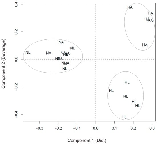 sPLS-DA model representing the four experimental groups in two components according to their peptide profile. NA: standard diet and water; NL: standard diet and tomato juice; HA: hypercholesterolemic and high-fat diet and water; HL: hypercholesterolemic and high-fat diet and tomato juice; Component 1: diet and Component 2: beverage.