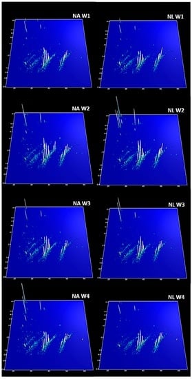 Urinary peptide fingerprints of groups control, NA and NL. The CE migration time (min) (X-axis) is plotted against the molecular mass (kDa) on a logarithmic scale (Y-axis). The Z-axis represents the mean signal intensity. W1–4: Week 1–4.
