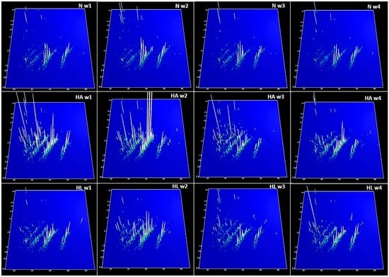 The urinary polypeptide fingerprints of the group with hepatic steatosis but without tomato juice consumption (HA) were very different to those of the other groups, showing a high complexity during the first three weeks—especially due to the high relative abundance of most of the peptides and the presence of high-molecular-weight peptides, as shown in the proteomic fingerprints (Figure 3).