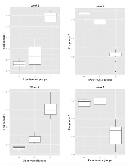 Box-and-whisker plots of component 1 for the three experimental groups (N, HA and HL) over four weeks.