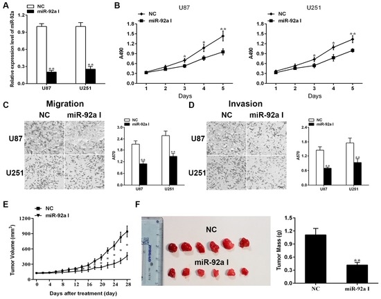 2.1. Depleting Endogenous miR-92a-3p Inhibits the Proliferationand Metastasis of Glioma Cells In Vitro While Preventing Xenograft Growth of Glioma In Vivo