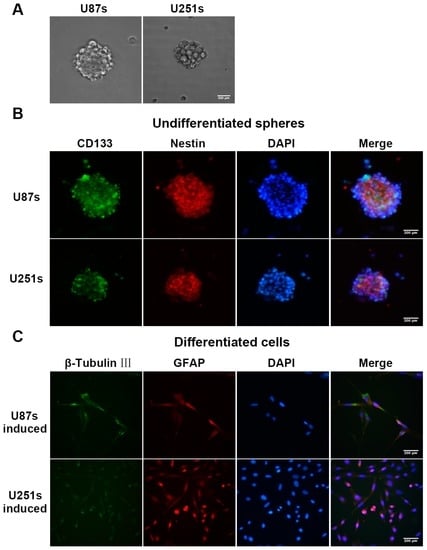 Human U87 and U251 glioma cells obtained from the Cell Bank of Chinese Academy of Sciences (Shanghai, China) were grown in Dulbecco’s Modified Eagle Medium (DMEM; Hyclone, Logan, UT, USA) supplemented with 10% Fetal Bovine Serum (FBS; Gibco, Carlsbad, CA, USA) at 37 °C in a humidified atmosphere of 5% CO2. The glioma stem-like cell lines U87s and U251s were isolated from U87 and U251 cells by using a serum-free clone formation method [14,47]. Glioma cells were dispersed and resuspended in the serum-free medium (SFM) composed of DMEM/F12 medium (Hyclone), B27 (20 mg/mL, Invitrogen, Carlsbad, CA, USA), 20 ng/mL basic fibroblast growth factor (bFGF; Sigma, St. Louis, MO, USA), 20 ng/mL EGF (PeproTech, Rocky Hill, NJ, USA). The primary tumor spheres were detected within 10 days of culture and subsequently dissociated and passaged in fresh medium every 3–4 days.