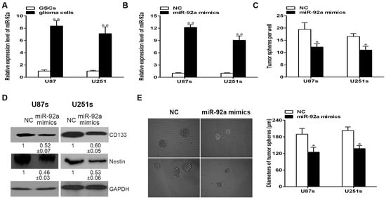 Function of miR-92a on the stemness of GSCs. (A) qRT-PCR analysis of miR-92a expression between glioma cells and GSCs; (B) qRT-PCR analysis of the expression of miR-92a in GSCs after treatment transfection with miR-92a mimics; (C) The self-renewal capability of GSCs was analyzed by tumor sphere formation assay; (D) The expression levels of cancer stem cell markers CD133 and Nestin were assessed by western blotting; (E) Diameters of GSCs were recorded and analyzed. Images were photographed at 100× original magnification. Each bar represents the mean of three independent experiments. * indicates p < 0.05, ** indicates p < 0.01. Scale bar represents 200 µm.